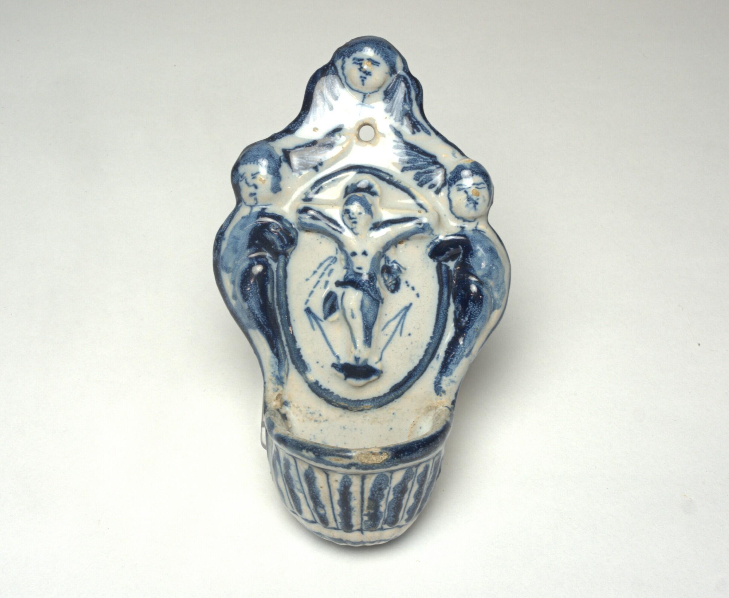 langwerpig met aan onderzijde halfrond, geribd bakje, op het bovenstuk, in reliëf Christus aan kruis in ovale rand, ruggelings geflankeerd door engeltjes ten voeten uit, bovenaan een engelenkopje met kruisje, met doorboort (ophang)gat. In reliëf Christus aan het kruis in ovaal (aureool) geflankeerd door engelfiguurtje. Bovenaan engelkopje. Beschildering blauw onderglazuur. (Nederlands)
