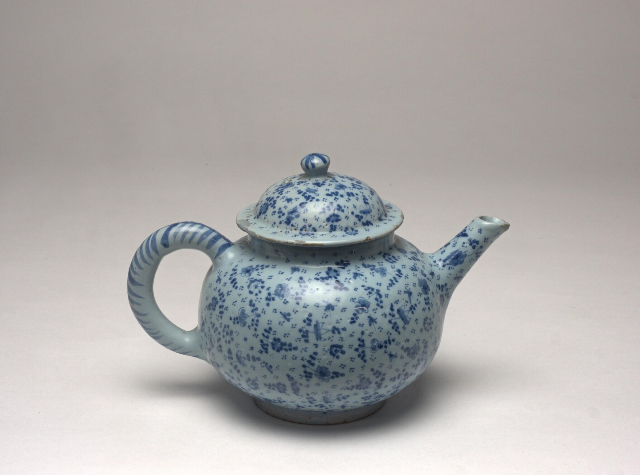 bolvormig met ingetrokken brede hals en voet, rechte schuinstaande tuit, C-vormig oor, koepelvormig deksel met smalle uitstekende rand en ronde knop, lichtblauw decor van strooibloemen, op het oor arceringen, op deksel een ster; Lichtblauw email. Decor van losse bloempjes (strooibloempjes) in blauw onderglazuur. (Nederlands)