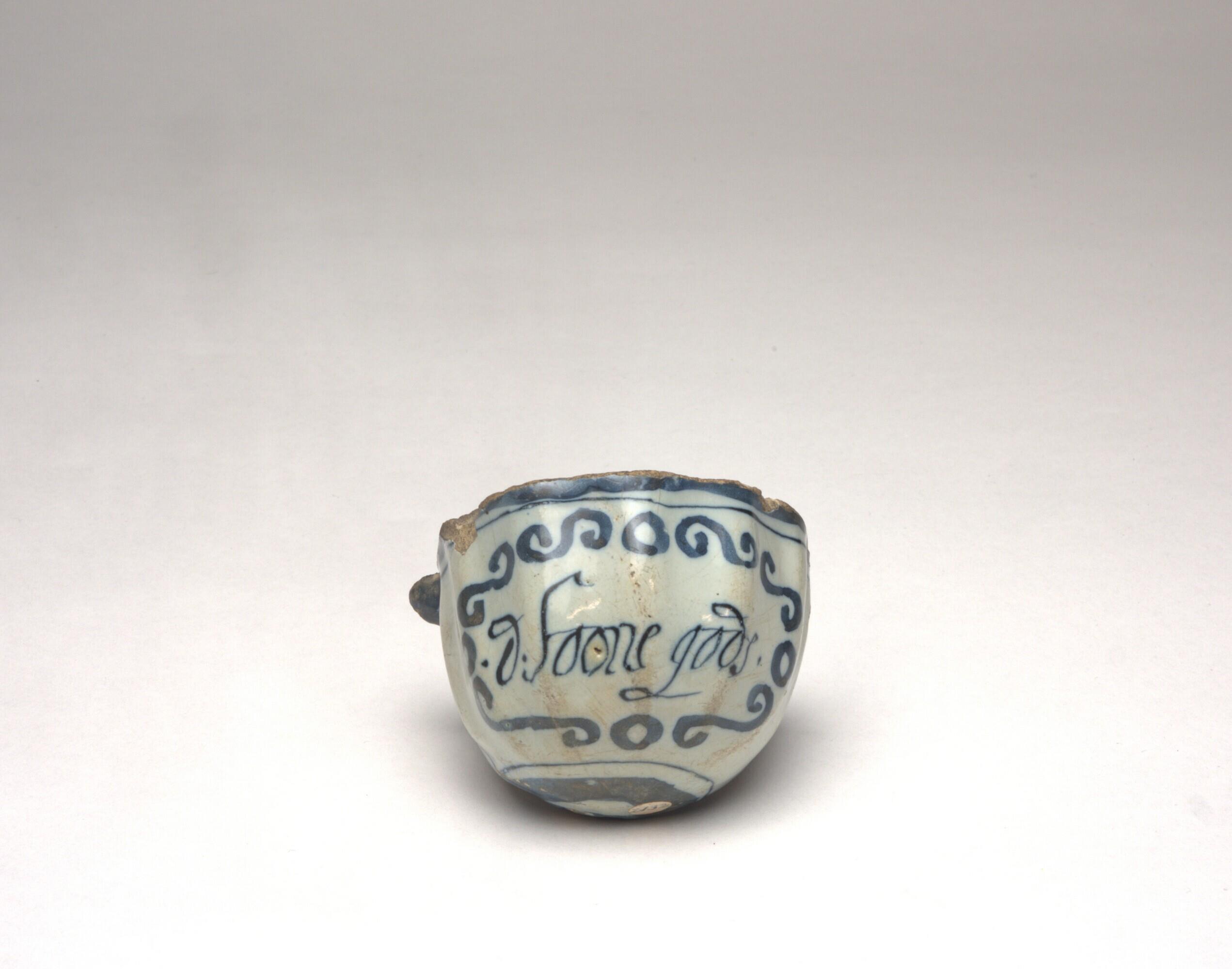 halfrond en geribd, opschrift: 'D.SOONE.GODS' omgeven door ornamentrandjes, gebiesde omlijsting (blauw). Geribd. Decor blauw onderglazuur; d Soone Gods, omgeven door ornamentaal randje, gekruld en rondjes, gebiesde omlijsting. Nog een deel tekst/letter te zien aan binnen/achterzijde (Nederlands)