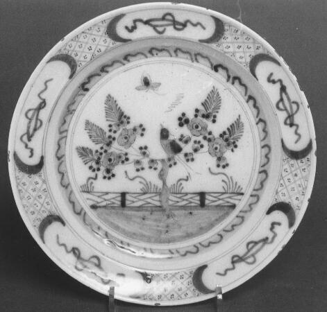 Bord op het plat gedecoreerd met een vogel in een boompje bij hek en vlinder in de lucht, bordrand met servetpatroon waarin vijf ovale uitsparingen waarin Chinees gelukssteken (Nederlands)