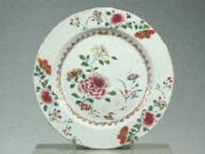 Plat famille rose bord met op het plat bloemen in een goudkleurige cirkel, Van Diepencollectie, JMD-P-1038 |