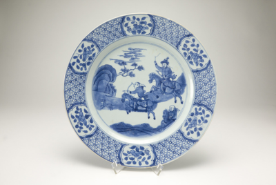 Blauw wit plat bord met landschapdecoratie met daarin drie jagers te paard jagend op een panter. De rand heeft een blauwe gearceerde versiering met zet uitsparingen met een bloemdecoratie. (Nederlands)