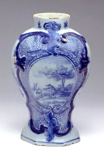 Achtzijdige balustervormige dekselvaas, waarvan de deksel ontbreekt, met voorstelling van man met stok aan rivieroever in Hollands landschap met rivier waarin zeilboot. De man voert eendjes. De voorstelling in geaccoladeerd en geprofileerd cartouche dat is opgevuld met blauwe stippels en aangekleed met lofwerk. Rondom de hals sterretjes en streepjes. Op de achterzijde bloem. (Nederlands)