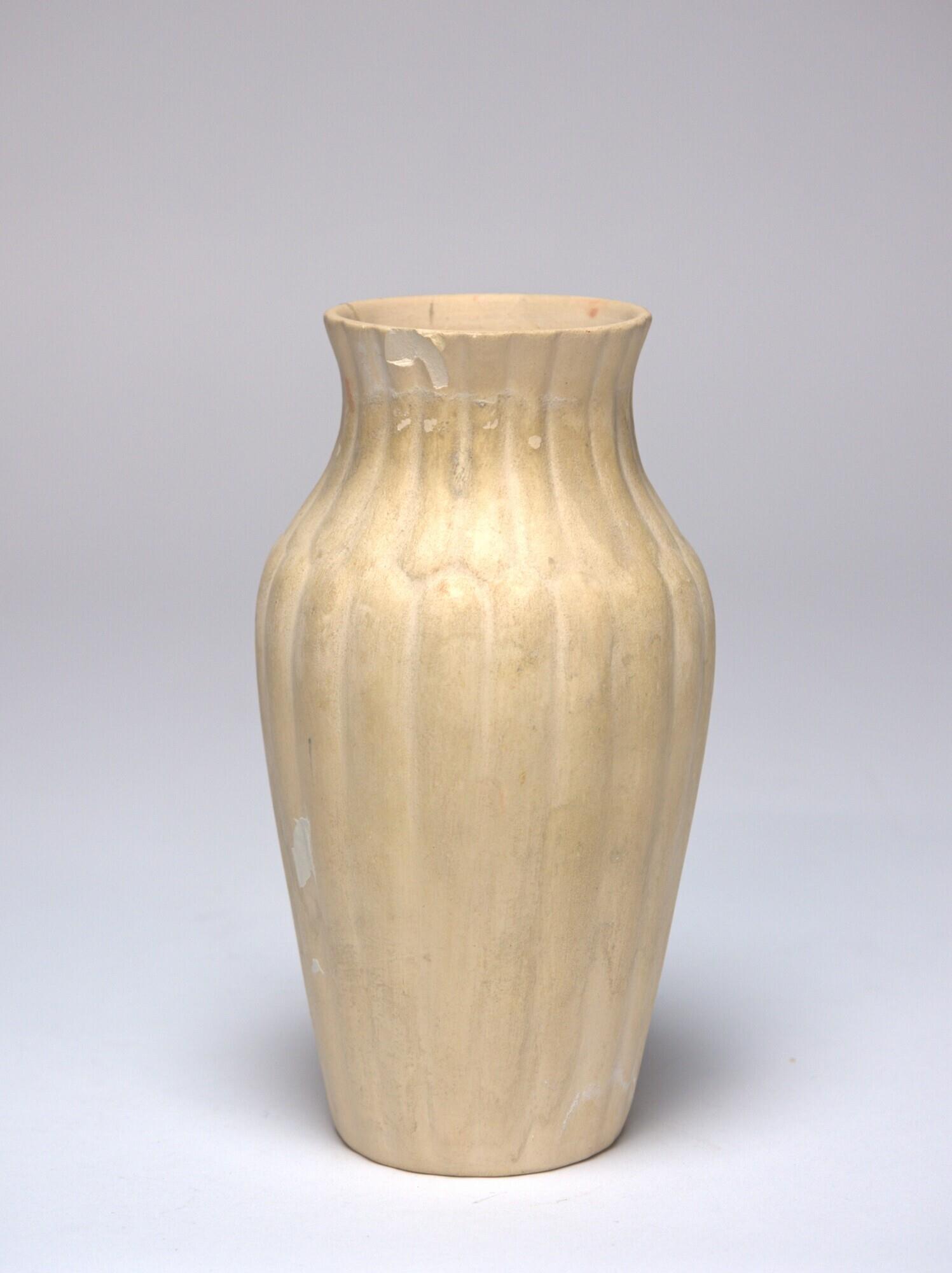 Productieproces van vijf vazen. De zesdelige werkset bestaat uit een mal waarin de geribde balustervormige vaas wordt gegoten en twee biscuit voorbeelden die niet beschilderd zijn. De volgende fase wordt gevisualiseerd door twee biscuit vazen die zijn beschilderd met bloemen, bladeren en ranken. De onderrand is voorzien van afhangende gestileerde bananenbladeren. Eén van de vazen is voorzien van een merk. Als laatste is de vaas geglazuurd. (Nederlands)