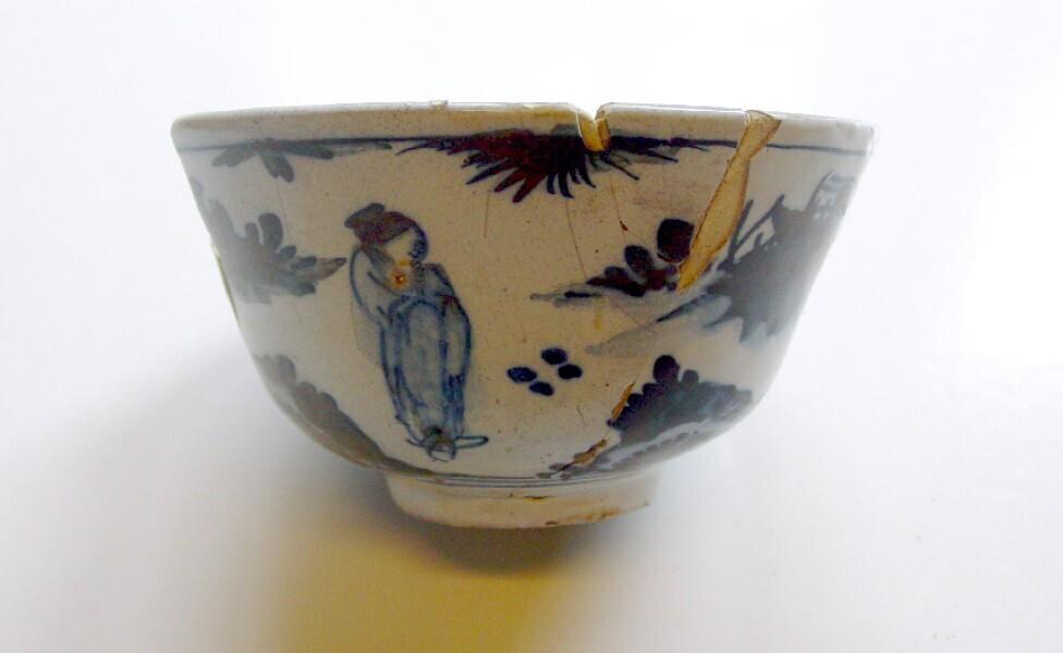 ext: landschap met Hollandse boerderij en Chinese vrouwfiguur (motief 3x herhaald); int. bodem: merkteken? (vogel?) en concentrische cirkels afdrukken bakpennen op rand standring recht uitstaande rand (Nederlands)