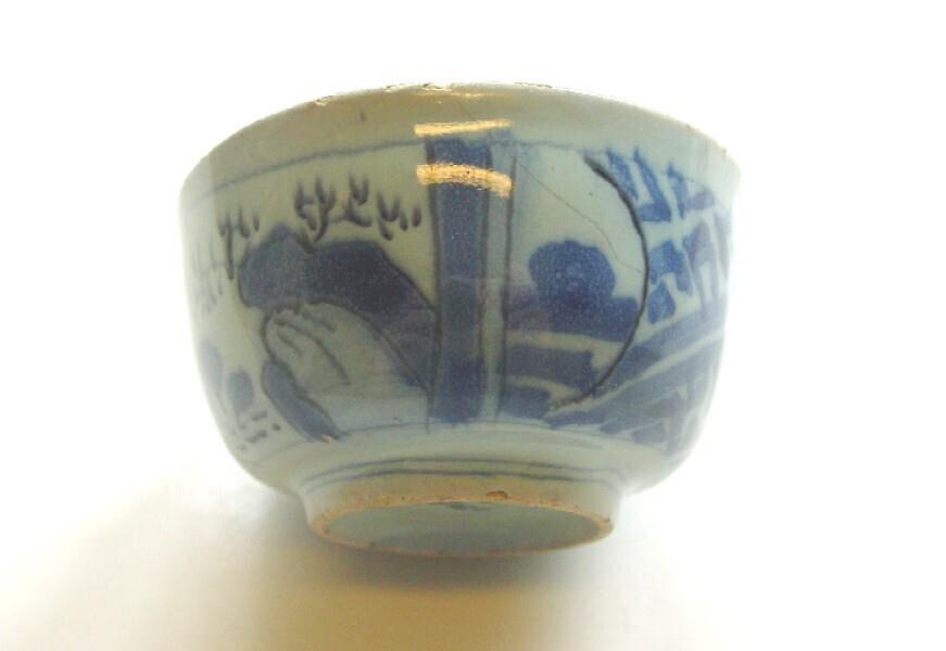 ext: 2 cartouches met Chinees landschap, ruimte ertussen gevuld met meander-motief; int. bodem: merkteken (bloemmotief), dunne lijn eromheen glazuur interieur iets doorgelopen standring recht uitstaande rand (Nederlands)