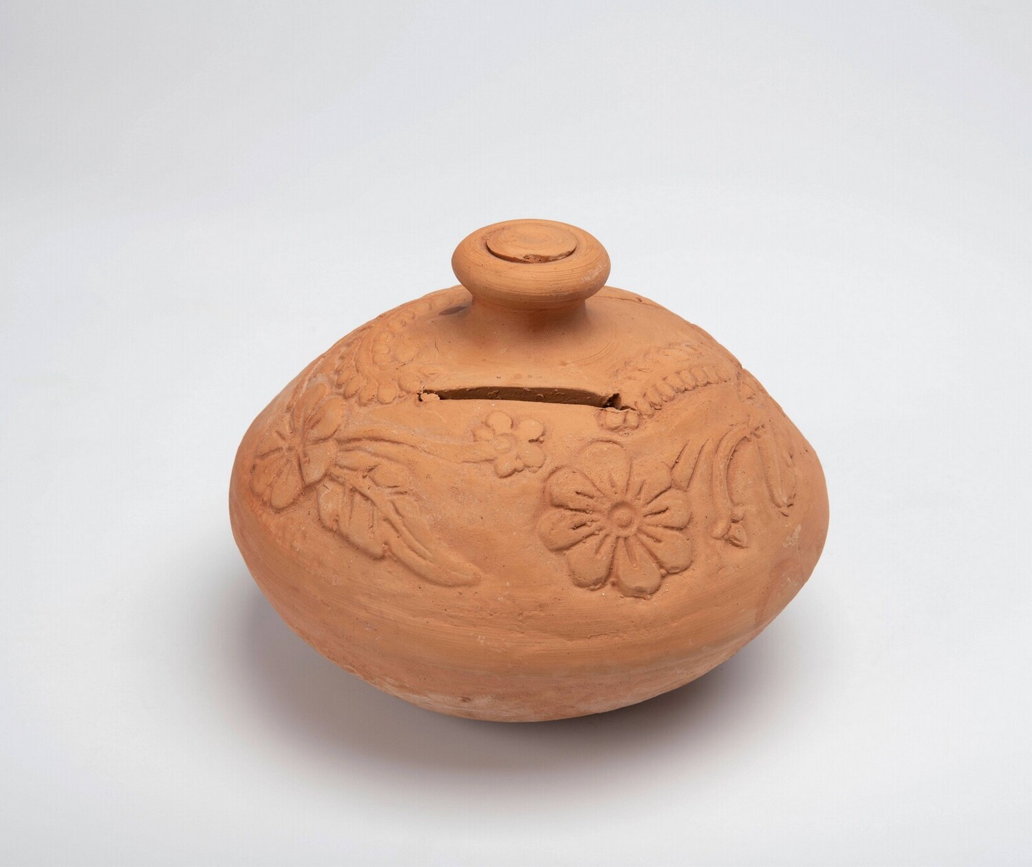 | Nederlands | Aardewerken spaarpot met een bloempatroon versierd |