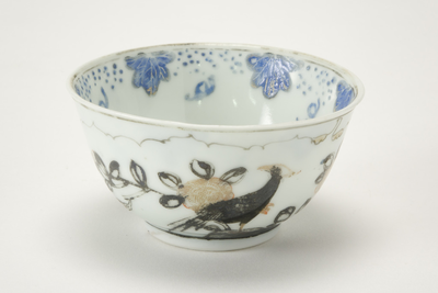 Wit kommetje met aan de binnezijde langs de rand een lichtblauw geemailleerde band met druivetrosjes. Op de buitenzijde vogels en bloemen in zwart, ijzerrood en goud. (Nederlands)