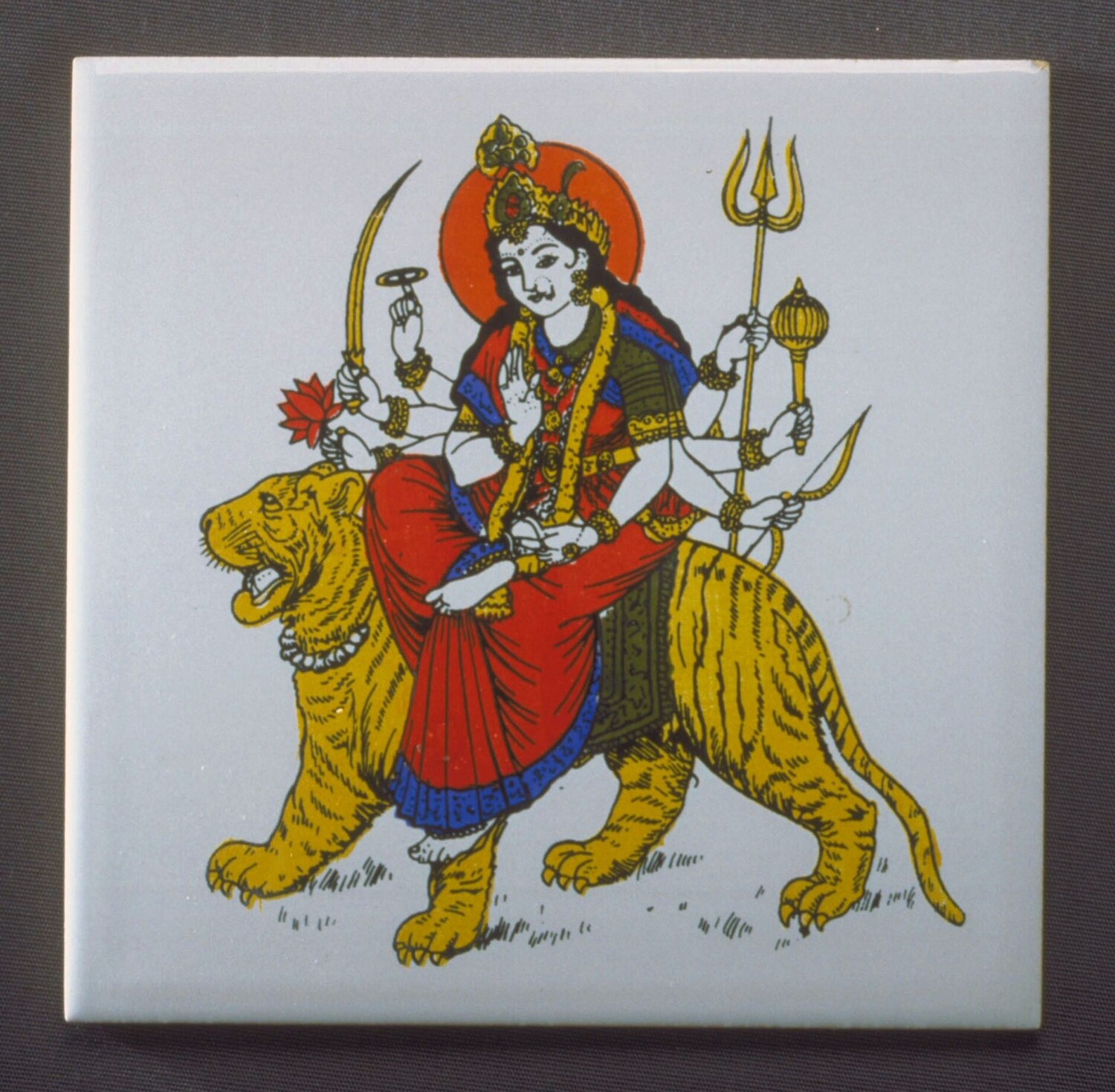 Geglazuurde tegel met de hindoegodin Durga op haar rijdier