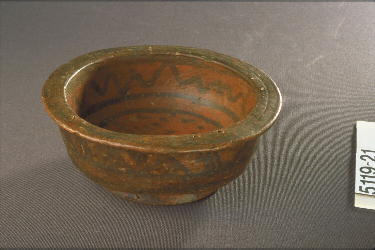 | Nederlands | Aardewerken kommetje met beschilderde versieringen van golflijnen, stippen en driehoeken aan binnen- en buitenzijde |