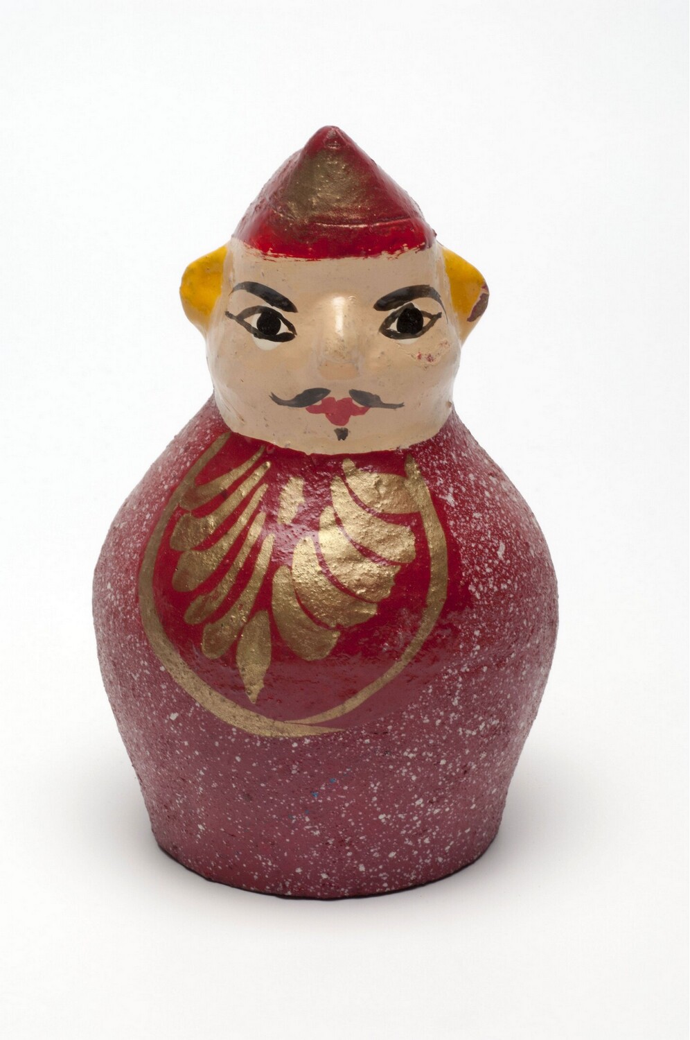 Aardewerken spaarpot in de vorm van een man met rood gespikkelt lichaam en rood mutsje (Q39151)