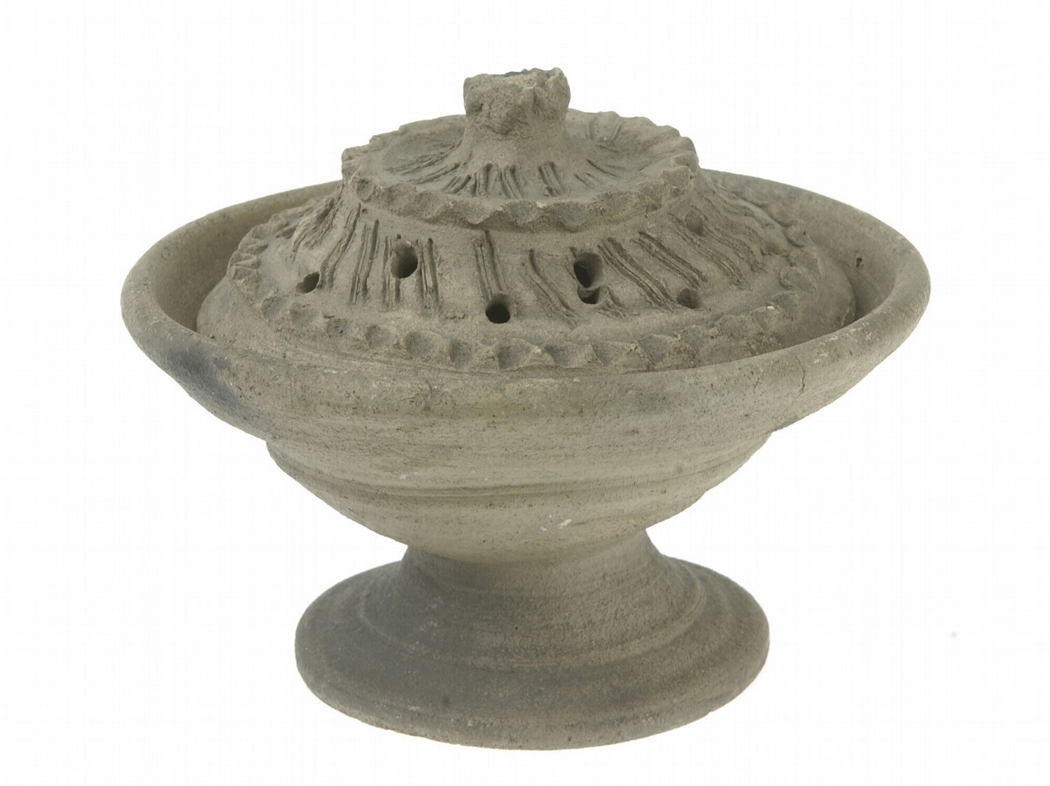 Aardewerken schaaltje op voet met geperforeerd deksel (Nederlands)