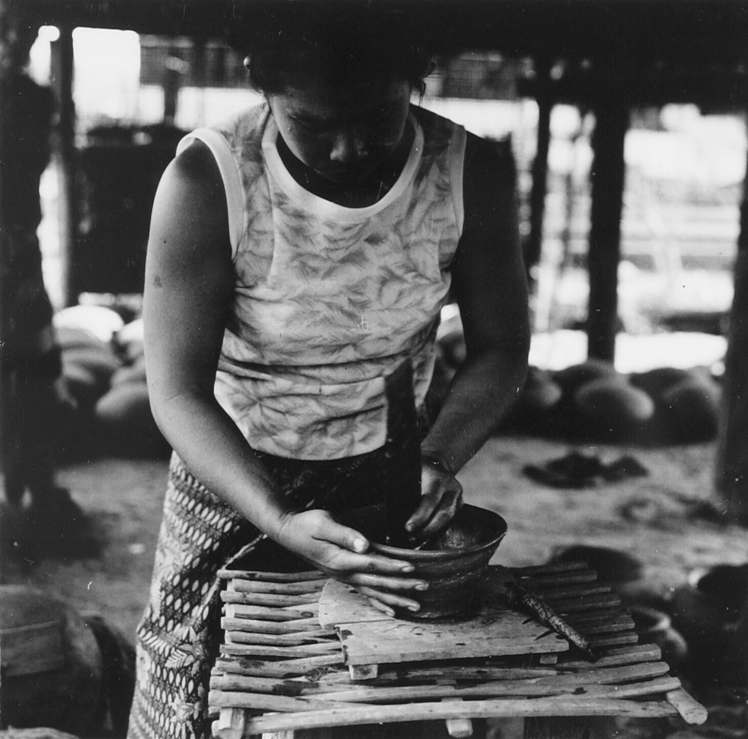 Het vervaardigen van aardewerk potten is een specialiteit van de vrouw. De potten worden gevormd volgens de z.g. csiling... van het pottenbakkerswiel. Ban Pa héo, San Kampeang, Noord Thailand.||Thailand||https://hdl.handle.net/20.500.11840/284004 |