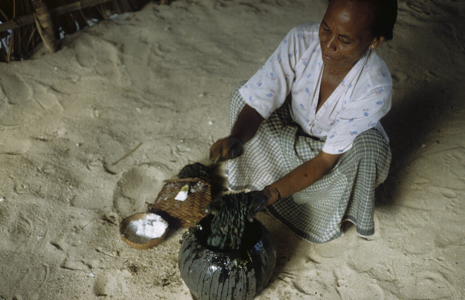 De geplukte indigobladeren worden met de hand fijngewreven en dan met wat water en kalk in een aardewerk pot gedaan. De ...worden in de pot gedaan en goed geroerd. Kandar op Selaru, Molukken.||Indonesië||https://hdl.handle.net/20.500.11840/477411