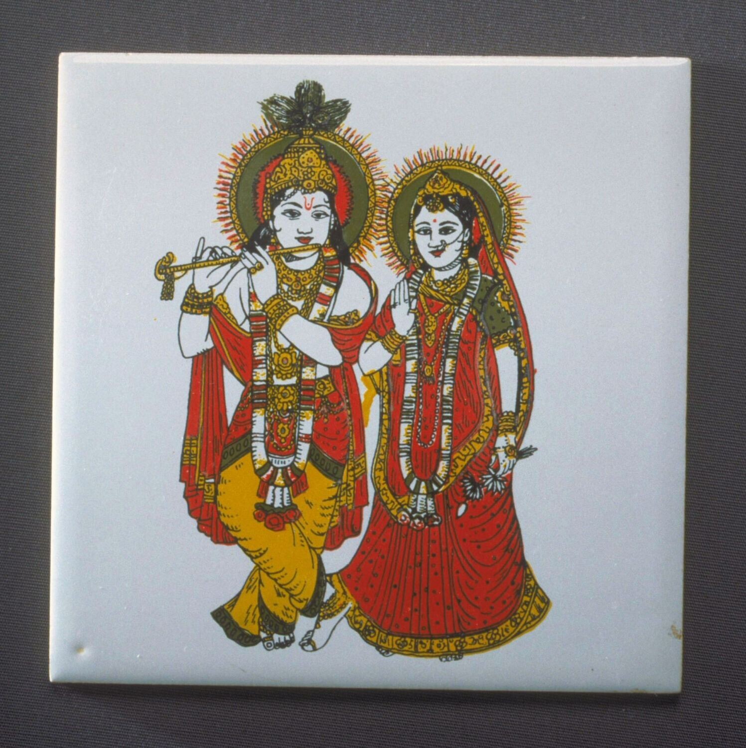 | Nederlands | Geglazuurde tegel voorstellend de Hindoegod Krishna en een herderinnetje |