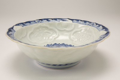Blauw witte kom met spreidende wand, klapmutsmodel, met reliëf cartouches met chinese karakters. Blauwe versieringen langs de binnenrand, om het plat en de voet.