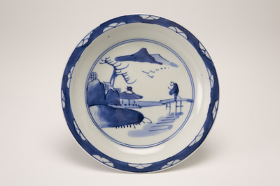 Blauw wit schaaltje met dikke scherf. Op het plat een blauw landschapdecor. (Nederlands)