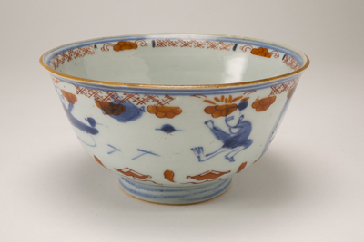 Amsterdams bont kom van porselein op standring gedecoreerd met in onderglazuur blauwe zotjes. Hierover gedecoreerd in ijzerrood met gestyleerde bloemen en lampionnen .