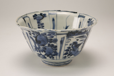 Grote grijs witte kom of kraaikop van porselein met geschulpte rand, beschilderd in onderglazuur blauw, Van Diepencollectie, JMD-P-1115 |