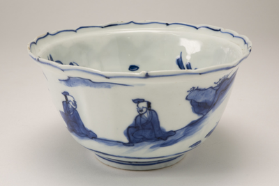 Grote kraaikop met een opstaande rand en een geschulpte lip, gedecoreed in onderglazuur blauw. Op de buitenzijde een landschap met daarin twee zittende wijzen. Op de binnenwand twee vruchtentakken en in het plat een vogel op een rots, kijkend naar de maan. (Nederlands)