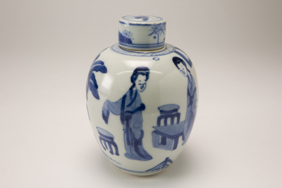 Bolle pot met cilindrische dop en op de buitenzijde blauwe lijzendecoratie. Versierd in onderglazuur blauw met een voorstelling van Go-spelende figuren zittend aan een tafel onder de maan. Links en rechts van hen planten. Op het deksel een plantendecor. De voorstelling van 'Lange Lijzen' is kenmerkend voor Kangxi export porselein, en werd veelal in Delft nagevolgd. (Nederlands)