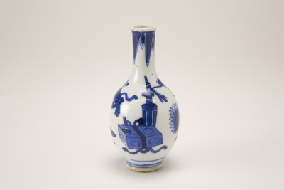 Bergblauw wit vaasje met smalle hals. Op het vaasje geluksbloemen o.a. een Koro.