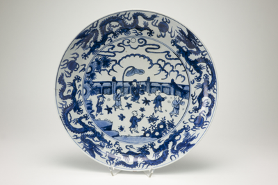 Dish on footring, spreading sides. Decorated in underglaze blue with six children playing in an enclosed garden, a cloudy sky above. On the sides four dragons each chasing a flaming pearl. The outside with four scalloped panels containing flower sprays, separated by single flower sprays. On the base the six-character mark Wanli in a double circle. (Engels)