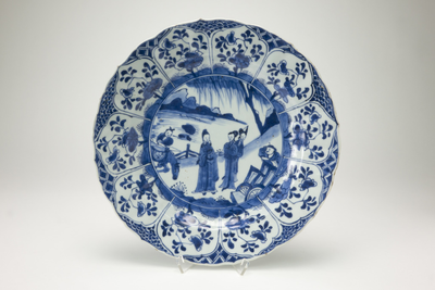 Grote Kang hsi porceleinen schotel met gegolfde en gelobde rand. Op de rand bloemdecoraties en op het plat een landschapdecor met lijzen.