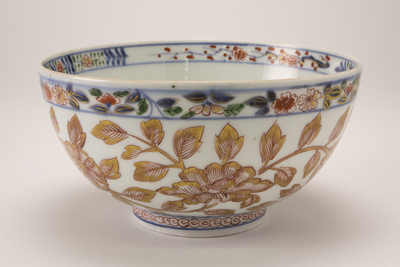 Witte Imari kom op standring met aan de buitenzijde goudkleurige bloemdecoraties. Langs de bovenrand aan de buiten- en binnenzijde een band met bladeren en bloemen.