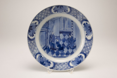 Blauw wit bord met op het plat een huisinterieur met een geblokte tegelvloer. In het huis zijn drie Chinese personen. De rand is versierd mer een facetpatroon waarin vijf uitsparingen zijn aangebracht welke zijn gevuld met een perzikdecor. (Nederlands)