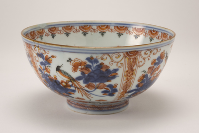 Amsterdams bont kom op standring met op de buitenzijde blauwe bloemdecoraties In emaille over gedecoreerd met bloemen en vogels in ijzerrood. Op het plat een hengselmand.
