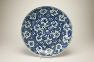 Dish on footring, spreading sides. Decorated in underglaze blue with the decoration in white reserved on a blue ground with a diaper pattern. In the centre a shell within a circle surrounded by six radiating lambrequin-shaped panels each containing a flower; similar lambrequins around the rim, scattered flowers between. On the outside flower scrolls, on the base a Fo-dog between cloud and flame motifs in a double circle. (Engels)