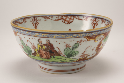 Amsterdams bont kom met een onderglazuur blauwe versiering. Op de buitenzijde een cartouche met een zittend Europees paar en een cartouche met appelboom met een appelplukker. Op het plat een hengselmand in ijzerrood. (Nederlands)