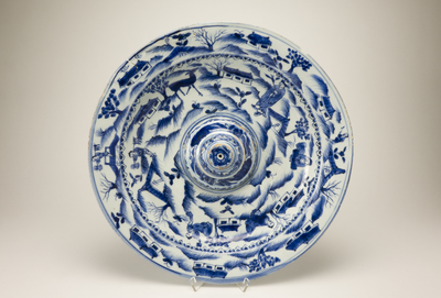Dish on footring, flat rim. In the centre a raised cone comprising three rounded sections. Decorated in underglaze blue. On the sides and rim a landscape with figures, houses, a deer, trees and fencing. Flower scrolls on the cone. (Engels)