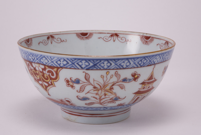 Amsterdams bont kom op standring. Aan de binnenzijde ijzerrode bloemversieringen. Op de buitenzijde tussen twee onderglazuur blauwe banden ijzerrode bloemdecoraties en twee pagodes. (Nederlands)