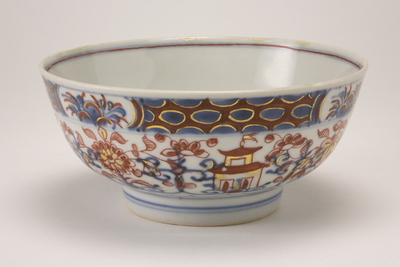 Amsterdams bont kom op standring met op de buitenzijde ijzerrode en goudkleurige bloemdecoraties, Van Diepencollectie, JMD-P-1175 |
