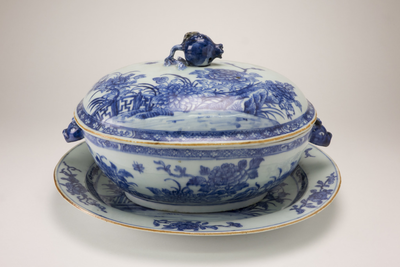 Zware, met blauw witte bloemen gedecoreerde soepterrine met deksel. De twee hengsels van de terrine zijn in de vorm van een varkenskopje. De knop van het deksel is in de vorm van een bolvormige bloemknop met takje en blaadjes.. (Nederlands)