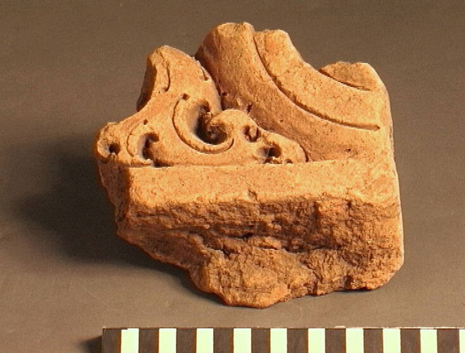 Baksteen van een bouwkundige versiering uit de Tjandi ruïnes bij Tanah Abang
