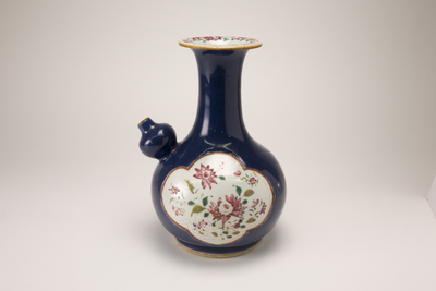 Kendi met donkerblauwe glazuurlaag (powder blue) en effen goud decor. Op de voor- en achterzijde een witte uitsparing met hierin een famille rose bloemdecoratie. (Nederlands)