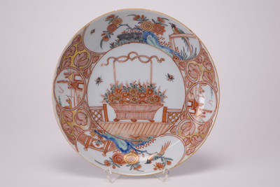 Dish on footring, spreading sides. Originally unpainted, decorated in The Netherlands with iron-red, green, blue, black and gold with a basket with an overhead handle filled with flowers on a veranda and two insects. On the sides two large panels with rocks, a hedge, a flowering prunus tree and a bird on a fence. In two smaller medallions a fisherman in a boat and two houses on the riverbank. Between the panels foliate scrolls. The reverse is undecorated. (Engels)