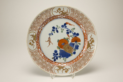Wit plat bord met op de rand rondom vele zeshoekige bloempjes met vier ovale uitsparingen met daarin een goudkleurige decoratie. Op het plat een meerkleurige bloemdecoratie.