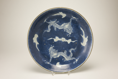 Blauw wit diep bord met op de lip een bruine lijn. In het blauw (powder blue) zijn twee primitieve draken en wolkjes uitgespaard.