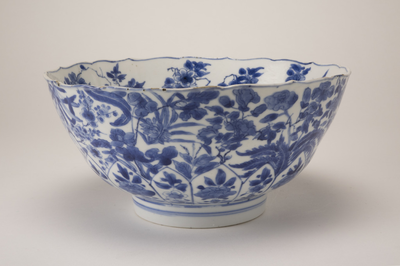 Witte gebombeerde kastkom met gegolfde rand. Op de bodem, in relief, een stervormige decoratie gevuld met bloemen. Lang de binnenrand diverse bloemtakken. De gehele buitenzijde gevuld met bloemen en bladeren. (Nederlands)