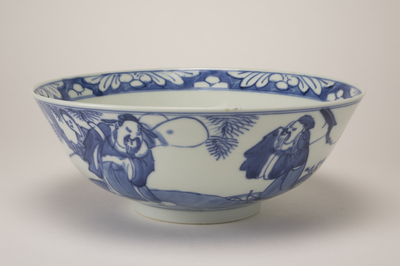 Witte kom met op de bodem een landschapdecor met vulkaan? Langs de binnerand een bloemenband. Op de buitenzijde een blauwe decoratie met drie geleerden en een bediende. (Nederlands)