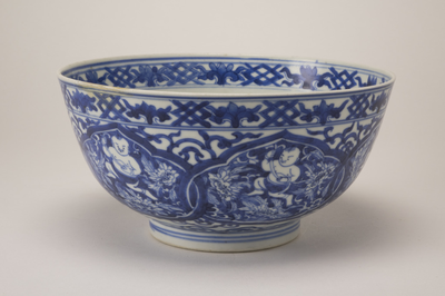 Zware witte kom met op de bodem, langs de randen en op de gehele buitezijde blauwe decoraties met o.a. carouches met hierin een sumo-jongetje met daaromheen witte bloemen. (Nederlands)