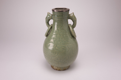Celadon vaas met reliëfdecoraties onder een groene glazuurlaag. De oren zijn in de vorm van olifantskoppen met ring vastgehouden door de slurf. Op de bovenrand een koperen ring. (Nederlands)