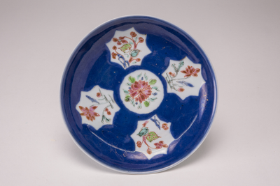 Powder blue schotel. Op het egaal blauwe plat vijf witte uitsparingen met hierin famille rose bloemdecoraties in rood, groen, lichtgroen, blauw en zwart. De buitenzijde ongedecoreerd. (Nederlands)