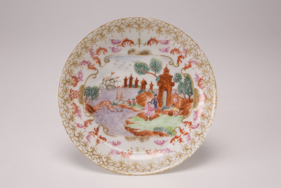 Witte schotel met op het plat een meerkleurige voorstelling van een "Hollands landschap" met vissende mensen, een boogbruggetje, torentjes, schepen en water. Langs de rand, deels weggesleten goudkleurige decoraties. (Nederlands)