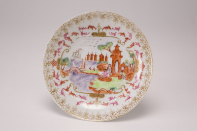 Witte schotel met op het plat een meerkleurige voorstelling van een "Hollands landschap" met vissende mensen, een boogbruggetje, torentjes, schepen en water. Langs de rand, deels weggesleten goudkleurige decoraties. (Nederlands)