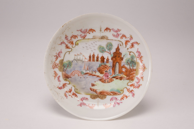 Witte schotel met op het plat een meerkleurige voorstelling van een "Hollands landschap" met vissende mensen, een boogbruggetje, torentjes, schepen en water, Van Diepencollectie, JMD-P-1287 |